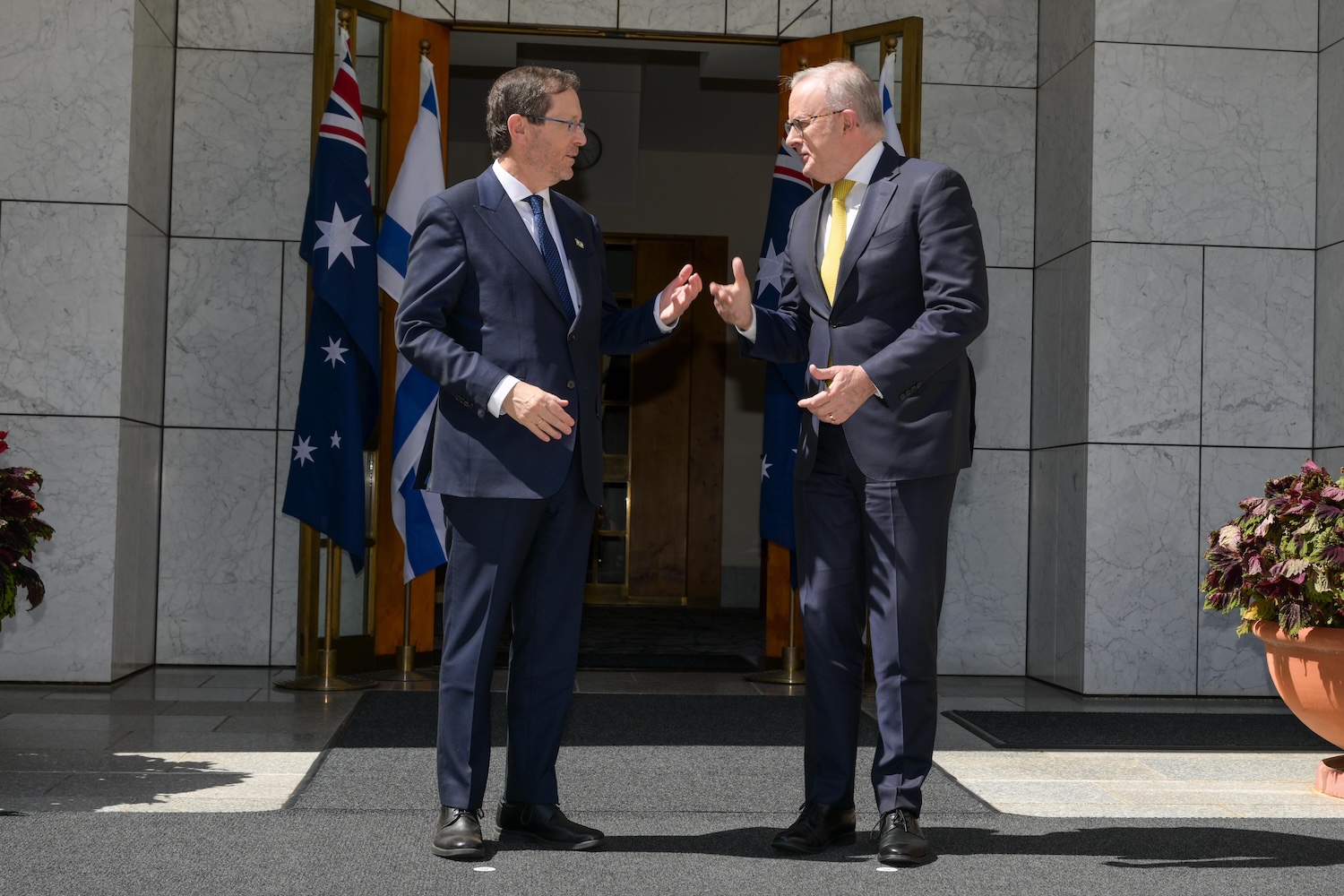 Israeli President Isaac Herzog (left) met on Wednesday with Australian Prime Minister Anthony Albanese in Canberra. Herzog will travel back to Israel today after a four-day visit, which also included stops in Melbourne and Sydney, that was marred by widescale protests targeting the president. |