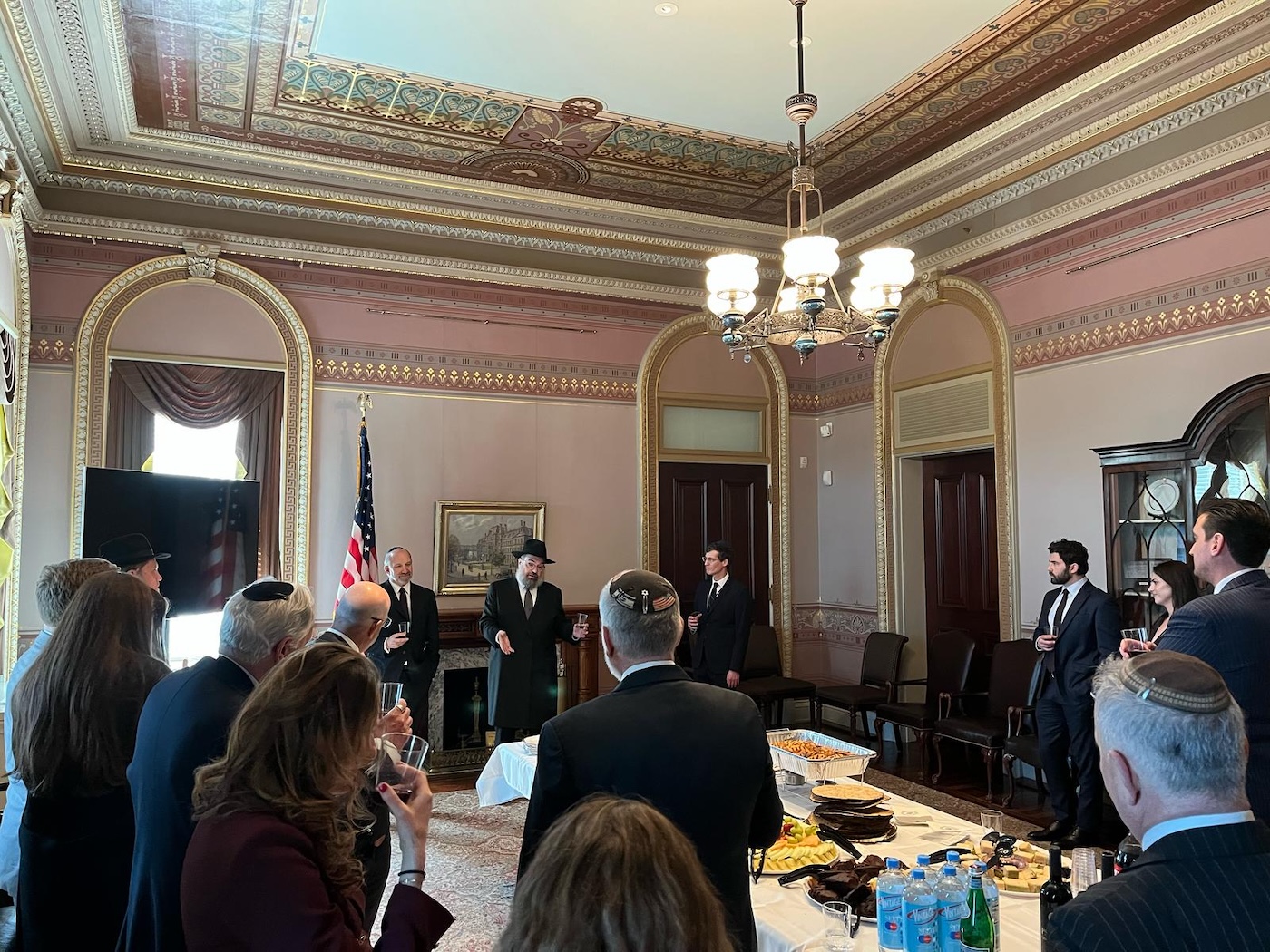 The White House held a Passover celebration this week for dozens of White House staffers and senior administration officials, including Commerce Secretary Howard Lutnick, White House Staff Secretary Will Scharf and Martin Marks. Led by Rabbi Levi Shemtov, executive vice president of American Friends of Lubavitch (Chabad), attendees and communal leaders said a L'chaim and noshed on matzah, gefilte fish and many other kosher-for-Passover delicacies. |