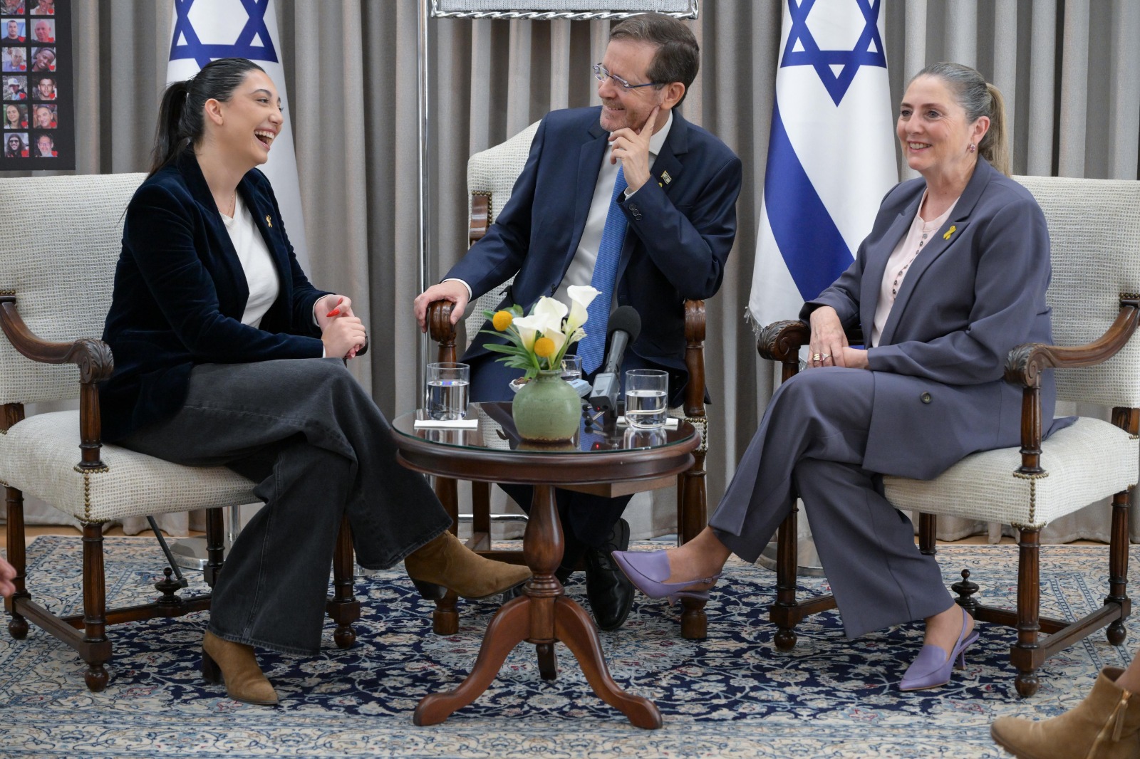 Singer and Nova music festival massacre survivor Yuval Rafael met with Israeli President Isaac Herzog and First Lady Michal Herzog before departing for the Eurovision Song Contest in Switzerland, which takes place next week, where she will perform "New Day Will Rise" as Israel's entrant in the annual competition. |