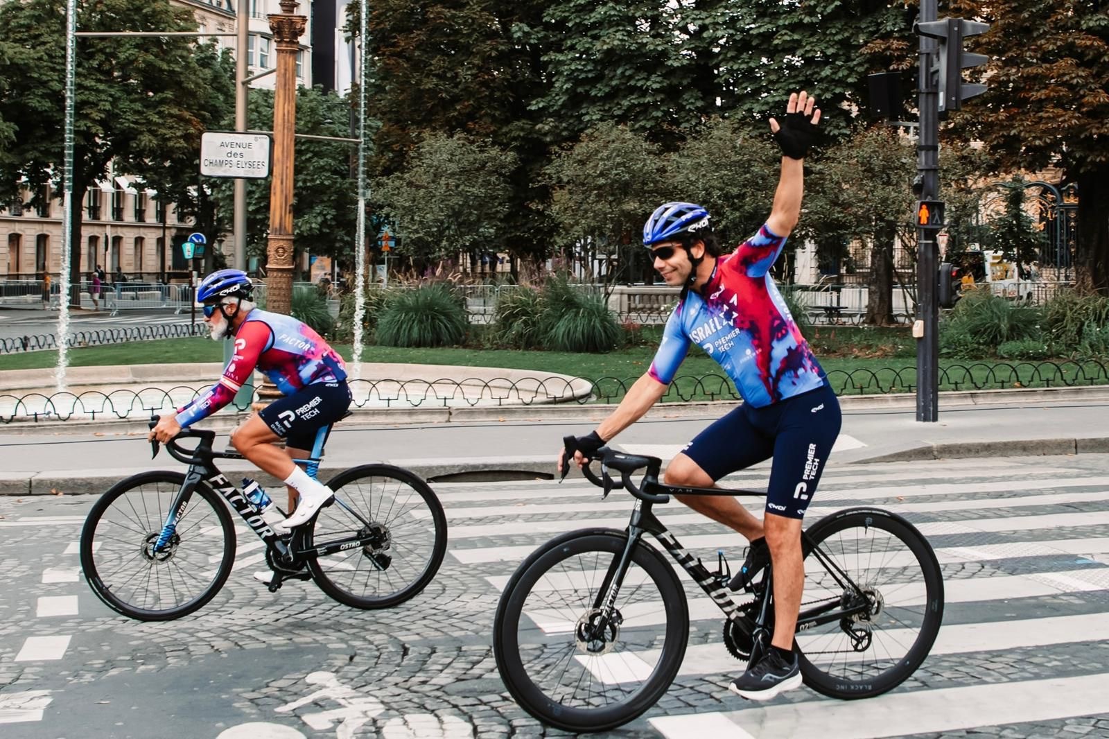 Ofer Calderon (right), who was held hostage by Hamas in Gaza for 484 days, cycled yesterday alongside Israel-Premier Tech team owner and philanthropist Sylvan Adams in the final stage of the Tour de France on the Champs-Élysées in Paris. On the 100th day of the hostages' captivity, Adams led a global cycling event in their honor and promised that when Calderson would be released, he would ride alongside him at the Tour de France. |