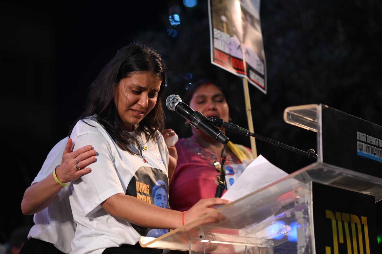 Seventeen-year-old Pushpa Joshi, the sister of Nepali hostage Bipin Joshi, speaks at a hostage rally in Tel Aviv on Saturday night. The Joshi family arrived in Israel last week for the first time as they work to raise awareness about the plight of Bipin, a farming student who was taken hostage on Oct. 7, 2023, from Kibbutz Alumim. |