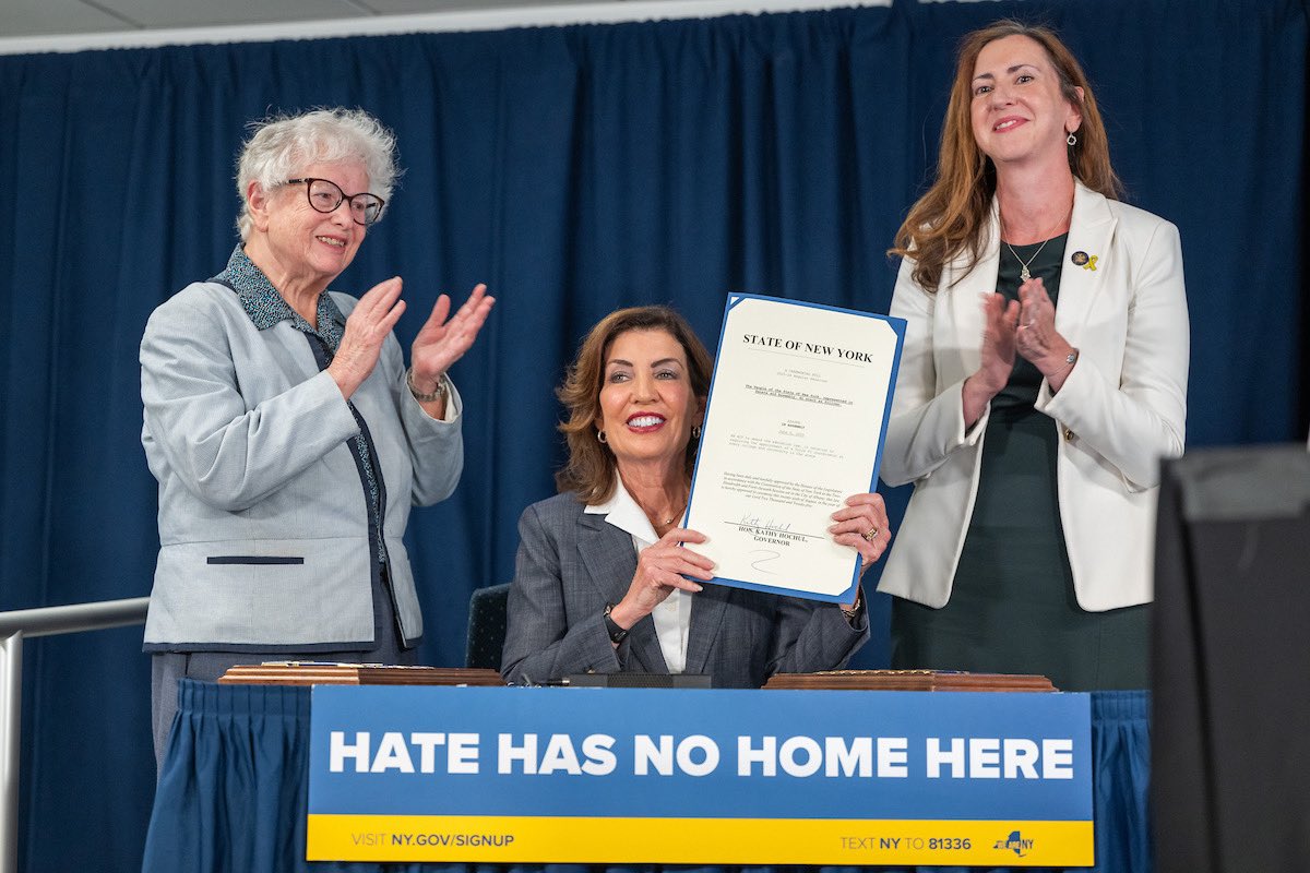 New York Gov. Kathy Hochul (center) signed into law legislation that requires all colleges in the state to designate anti-discrimination coordinators to enforce Title VI of the Civil Rights. Hochul was joined by state Sen. Toby Ann Stavisky (left) and Assemblywoman Nily Rozic (right), who sponsored the legislation in their respective chambers. More on the new law here. |