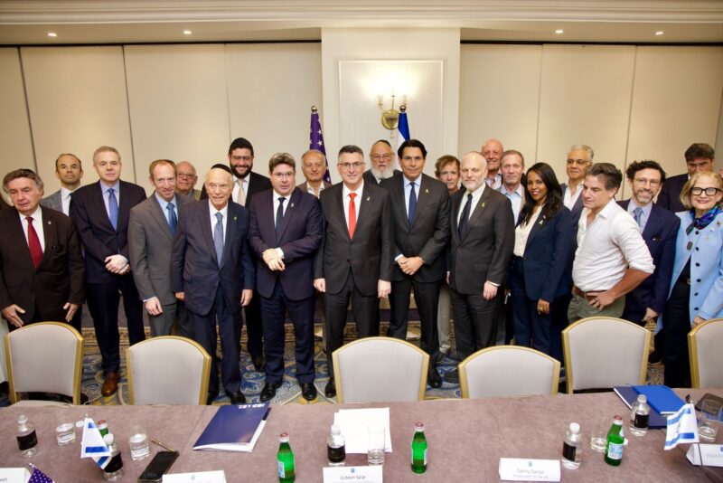 Israeli Foreign Minister Gideon Sa'ar (front row center with red tie) met with some two dozen American Jewish leaders in New York City on Tuesday, briefing them on developments in Israel and hearing their concerns, ahead of a speech in the United Nations about the plight of Israeli hostages being held in Gaza, participants told eJewishPhilanthropy. |