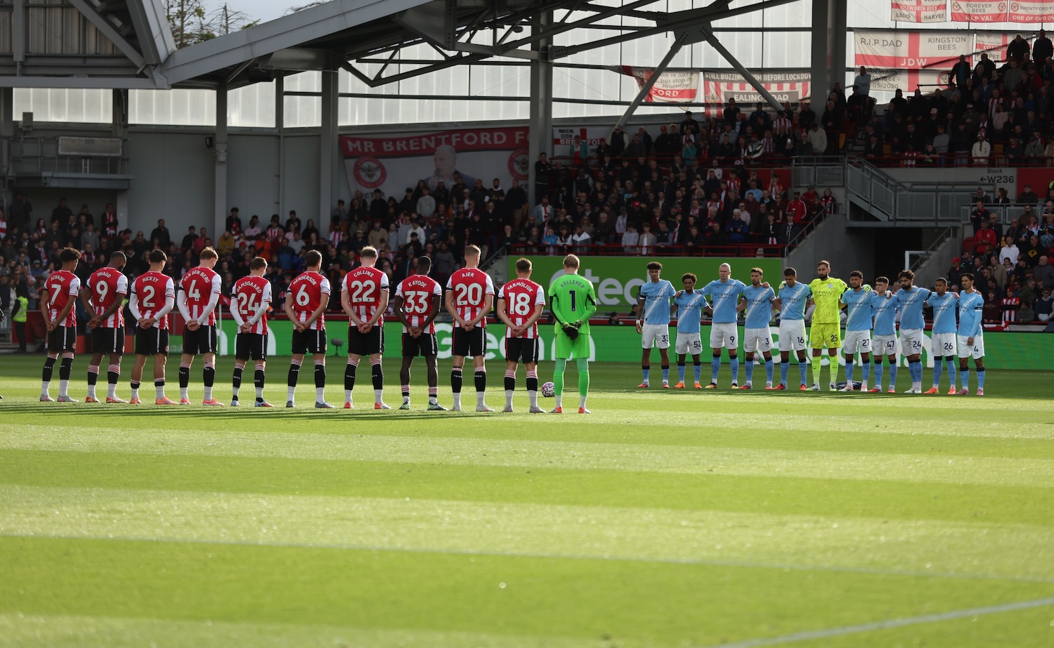 Players from Manchester City and Brentford FC observed a moment of silence on Sunday in memory of the two Jewish men killed in a terrorist attack at a Manchester synagogue on Yom Kippur ahead of the teams' Premier League match in Brentford, U.K. |