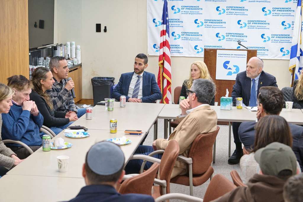 The Conference of Presidents of Major American Jewish Organizations hosted a roundtable in New York on Monday with recently released hostages, including Omri Miran (pictured with microphone). |