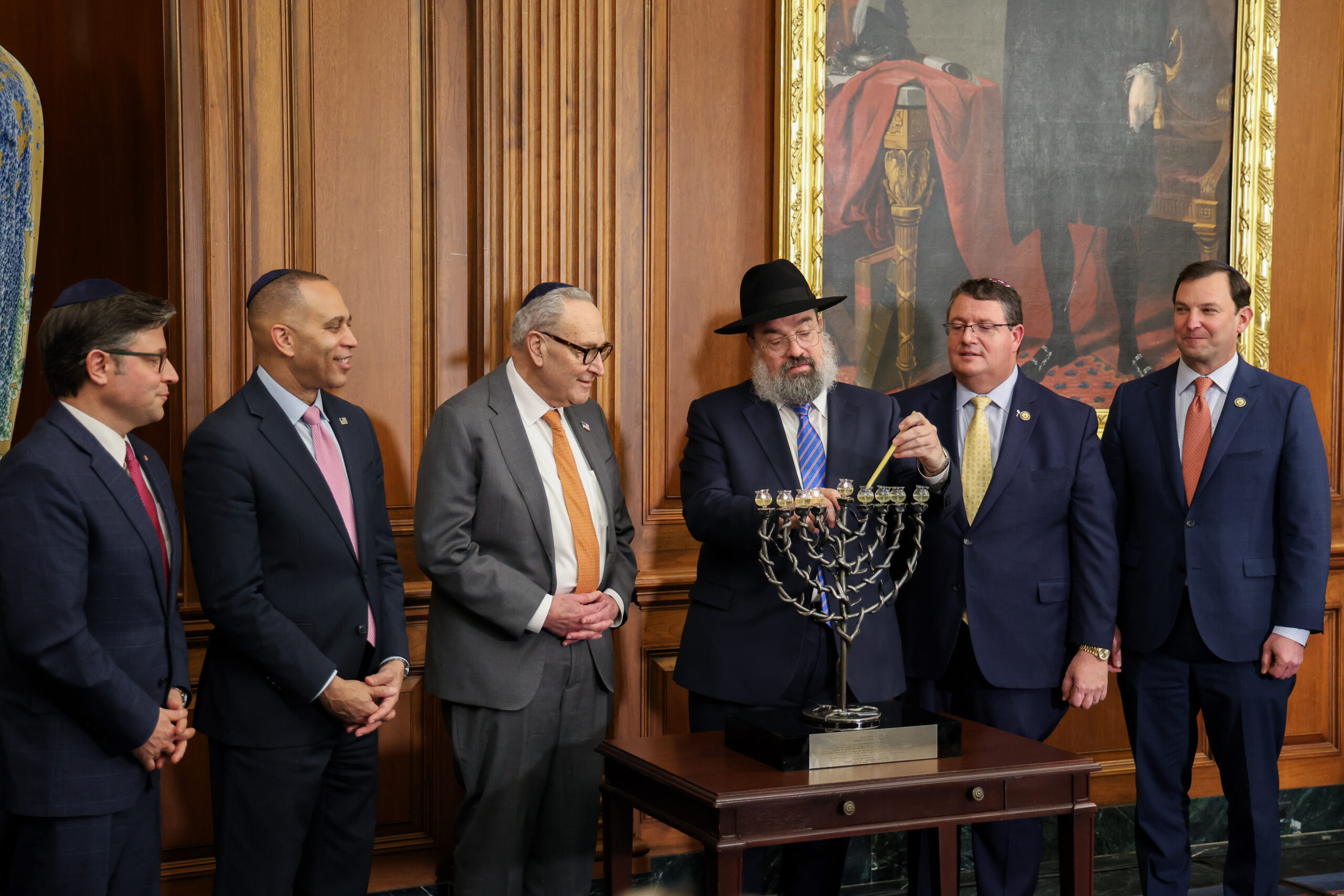 House Speaker Mike Johnson (R-LA), Senate Minority Leader Chuck Schumer (D-NY) and House Minority Leader Hakeem Jeffries (D-NY) hosted a pre-Hanukkah menorah lighting ceremony yesterday on Capitol Hill alongside Chabad Rabbi Levi Shemtov, the executive vice president of American Friends of Lubavitch (Chabad), Jewish Insider's Emily Jacobs reports. Pictured with the congressional leaders are Reps. Randy Fine (R-FL) and Craig Goldman (R-TX). |