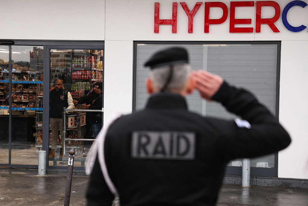 Guillaume Cardy, the chief of the French National Police's elite unit RAID (Research, Assistance, Intervention, Deterrence), paid his respects on Monday at Paris' Hypercacher supermarket during a ceremony commemorating the 11th anniversary of the deadly Islamist attacks on the kosher market as well as the offices of the Charlie Hebdo satirical newspaper. |