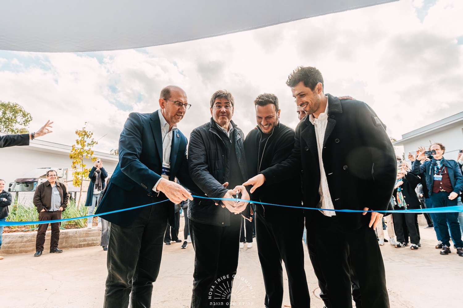 Survivors of the Nova Music Festival massacre gathered on Wednesday, together with families of victims of the attack, for a ribbon-cutting ceremony and guided site visit at the Diane Goldman Kemper & Robin Kemper Home for Inclusivity, located in the Ilanot Forest outside of Netanya, Israel. The event marked the public unveiling of UJA New York Beit Nova, a permanent home dedicated to recovery, support and remembrance for survivors and bereaved families, funded primarily by UJA-Federation of New York. Pictured at the ribbon-cutting ceremony, from left: Mark Medin, the federation's executive vice president; Eric Goldstein, its CEO; Ofir Amir, co-founder and survivor of the Nova Music Festival; and Reef Peretz, chairperson of The Tribe of Nova Foundation. |