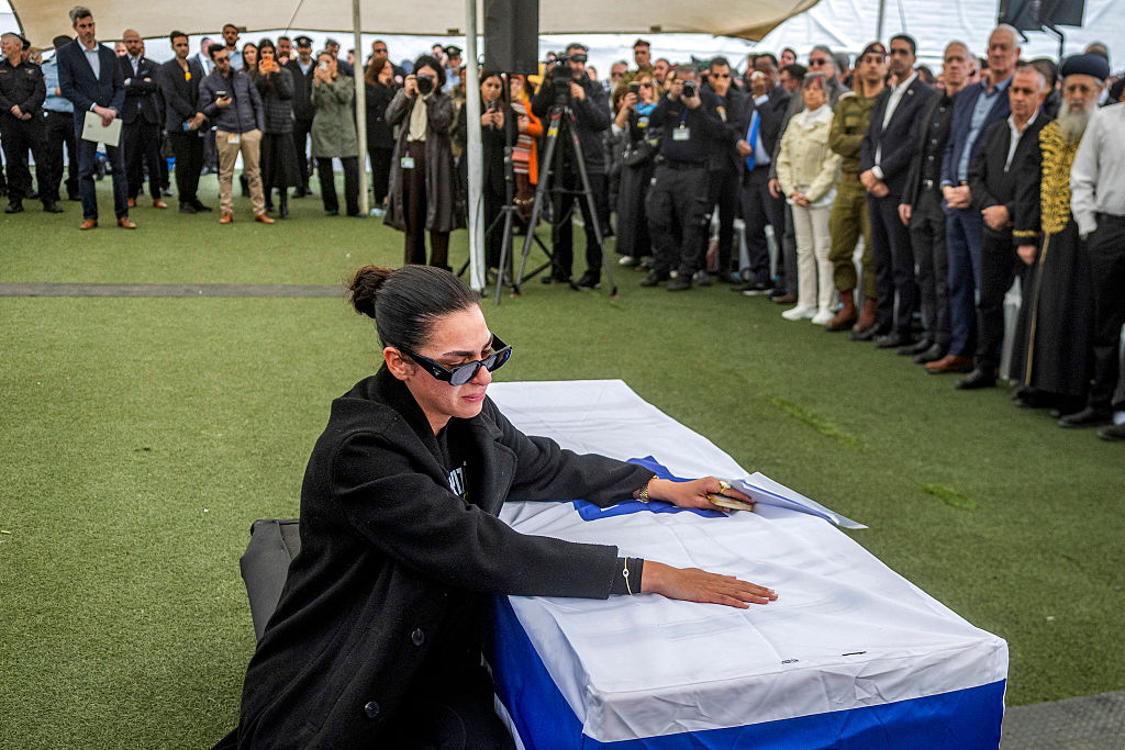 Shira Gvili mourned at the casket of her brother, slain IDF soldier Ran Gvili, at his funeral in Meitar, Israel, yesterday, two days after his body was recovered by the IDF in a cemetery in the Gaza Strip. Gvili was killed in battle on Oct. 7, 2023, and his body was brought to the enclave, where it remained after every other living and dead hostage was repatriated to Israel. |
