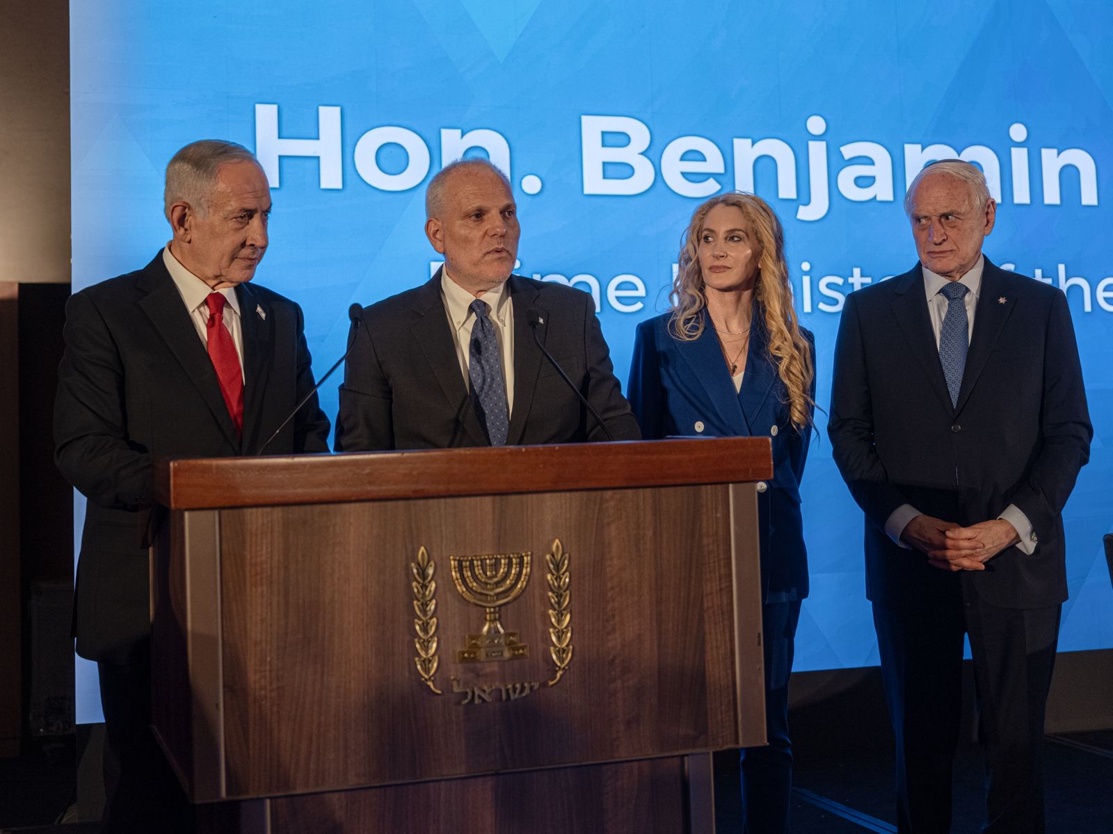 Israeli Prime Minister Benjamin Netanyahu (left), Conference of Presidents of Major American Jewish Organizations CEO William Daroff, Conference of Presidents Chair Betsy Berns Korn and former Conference of Presidents Executive Chairman Malcolm Hoenlein addressed the delegation of Jewish organizational leaders on Sunday in Jerusalem. |