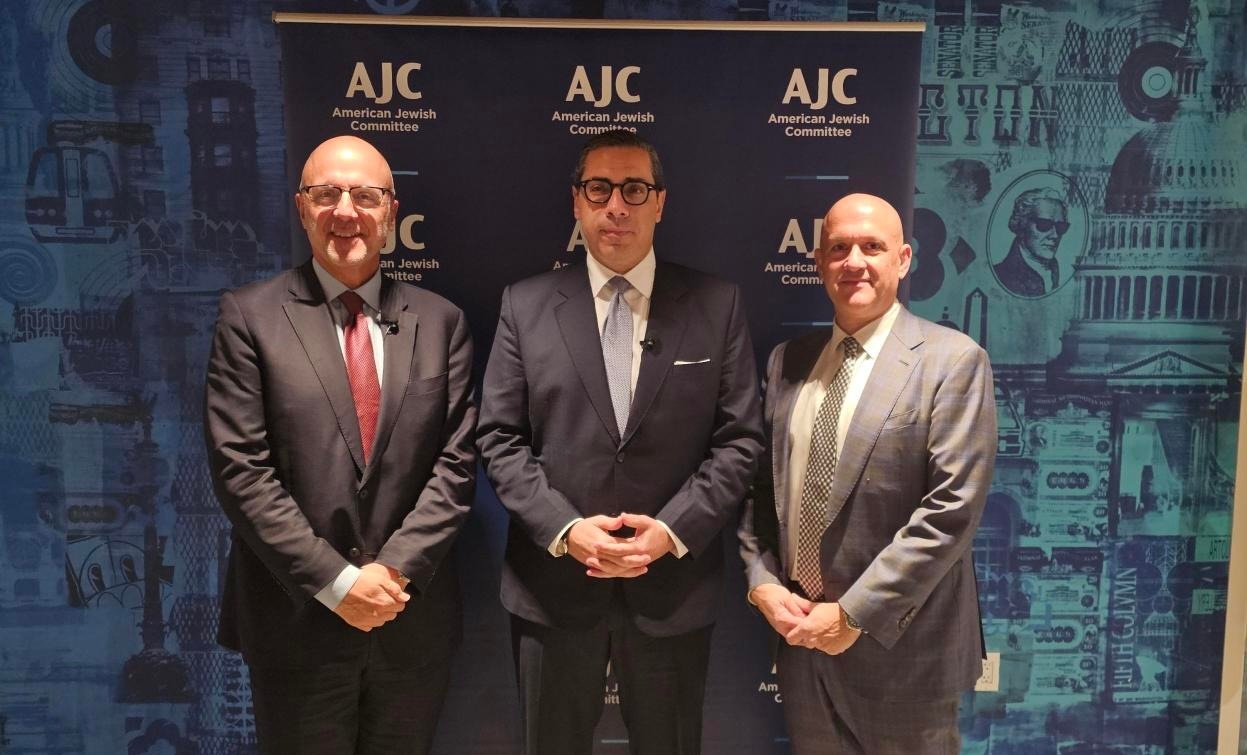 Cypriot Foreign Minister Constantinos Kombos (center) met earlier this week with American Jewish Committee CEO Ted Deutch (left) and Hellenic American Leadership Council Executive Director Endy Zemenides at AJC's Washington office to discuss the opportunities and challenges presented by the India-Middle East-Europe Economic Corridor. |
