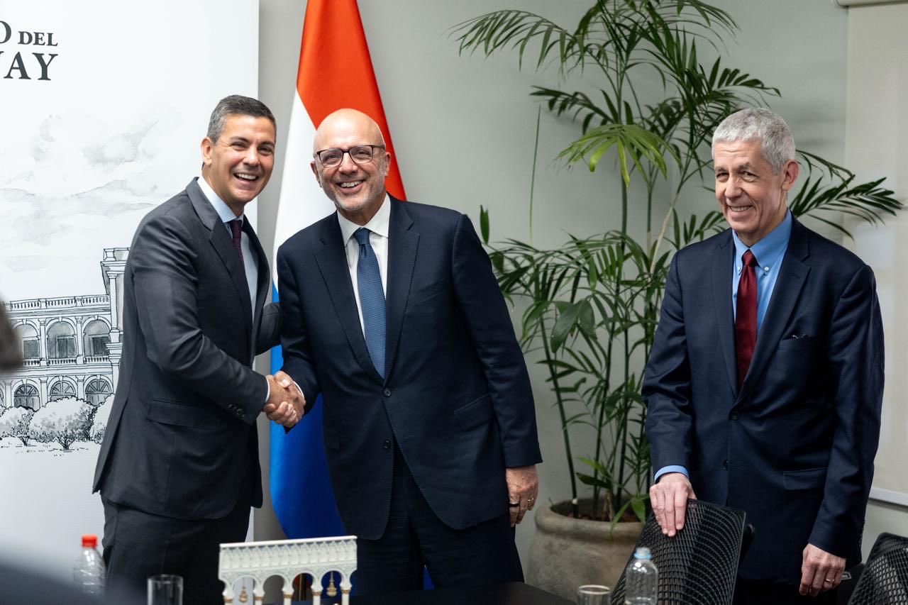 A delegation of the American Jewish Committee, led by CEO Ted Deutch (center) and President Bobby Lapin, met Tuesday with Paraguayan President Santiago PeΓ±a (far left) in the group's first-ever visit to Paraguay. |