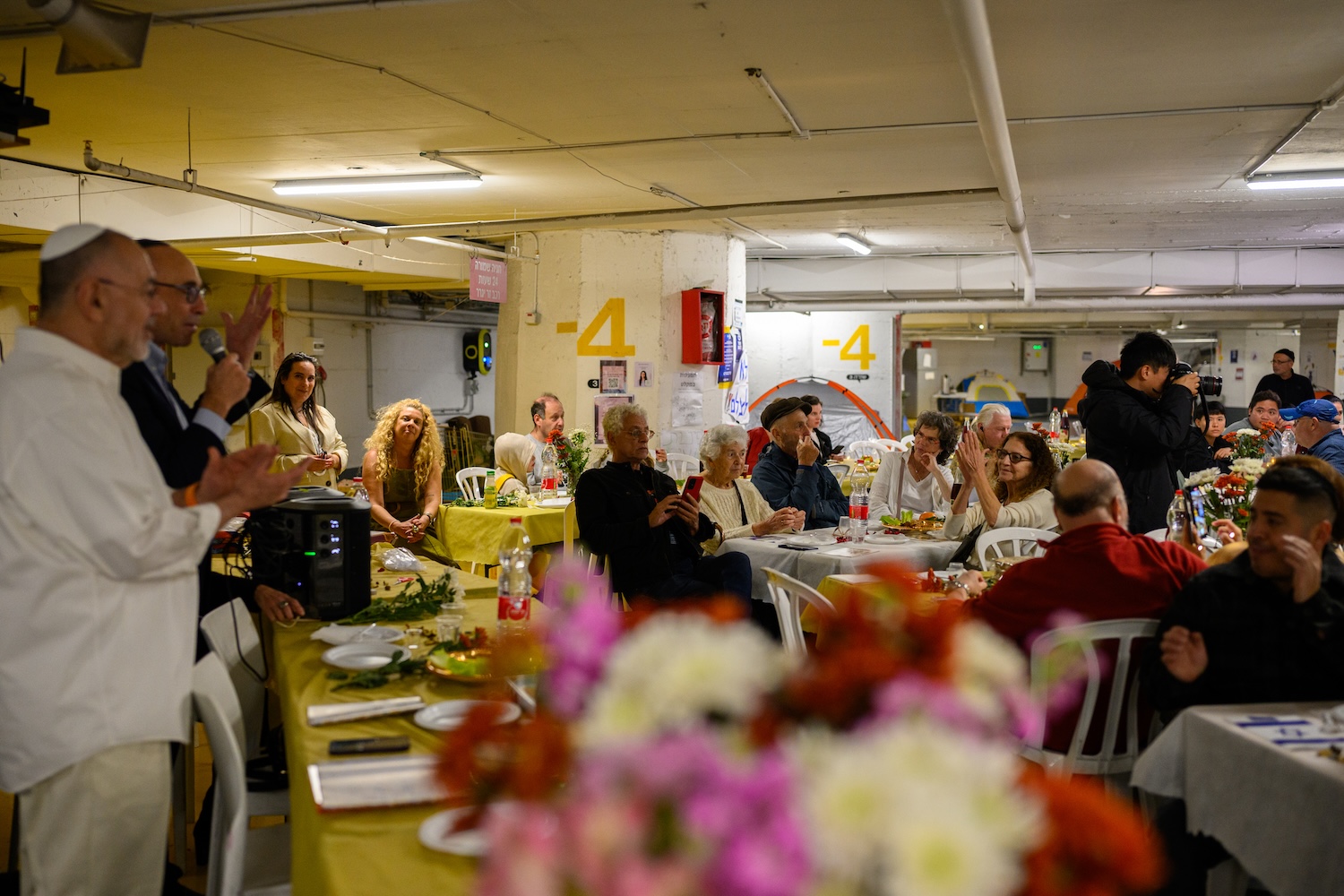 People participated in a communal Passover Seder on the first night of the holiday in an underground parking lot in Tel Aviv, Israel, that since the start of the war with Iran has served as a community bomb shelter.
